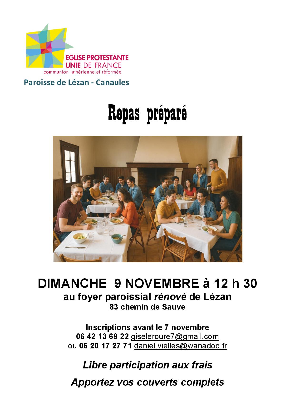 Dimanche 09 Novembre à 12h30 : Repas préparé au foyer paroissial de Lézan. Inscription auprès de Gisèle Roure (06 42 13 69 22) ou Daniel Vielles (06 20 17 27 71). affiche jointe