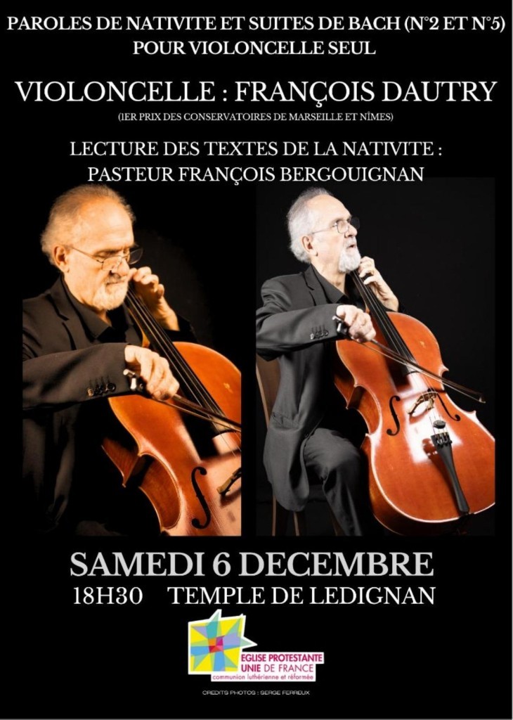 Samedi 6 décembre à 18h30 : Concert « paroles de nativité et suites de Bach pour violoncelle » au temple de Ledignan. affiche jointe