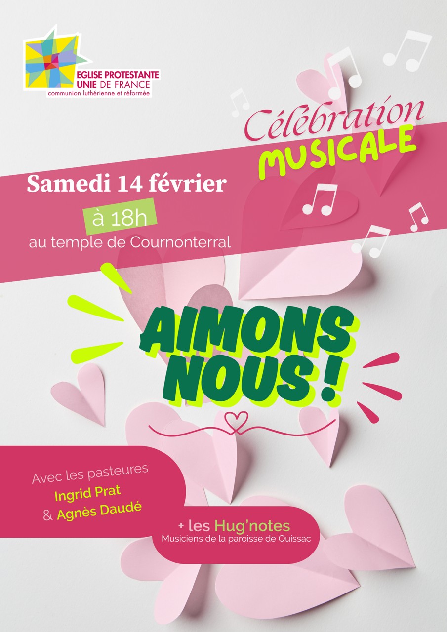 Samedi 14 février à 18h00: Célébration Musical au Temple de Cournonterral avec les Pasteures Ingrid Prat et Agnès Daudé affiche jointe